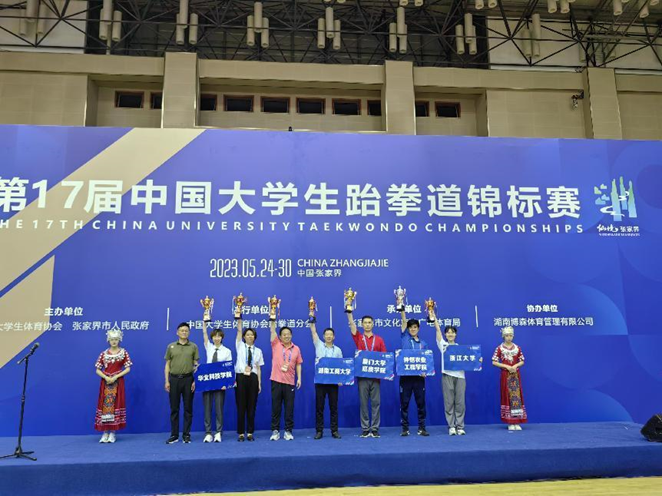 5月24日至5月30日,由中国大学生体育协会主办,张家界市文化旅游广电体育局承办的第十七届中国大学生跆拳道锦标赛,在张家界市第一中学体育馆顺利进行。本届运动会参赛规模、竞技水平均创造了历史之最,全国共185所高校,1500余名运动员参与比赛,我校跆拳道队队员:(女子)谢凰,满凌云,王佳云,刘晶颖,刘欣雨;(男子)曾实,蒲祖忻,彭旭,邓凯,张起瑞,由教练员吴应广、郑一中老师带队参加了此次比赛。